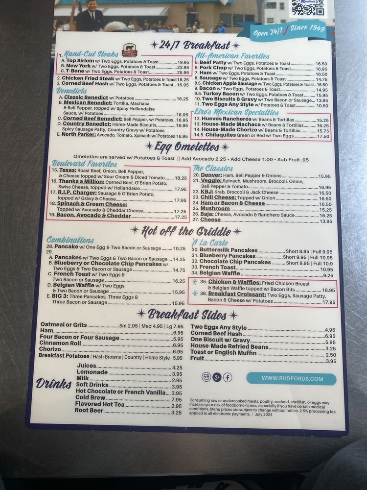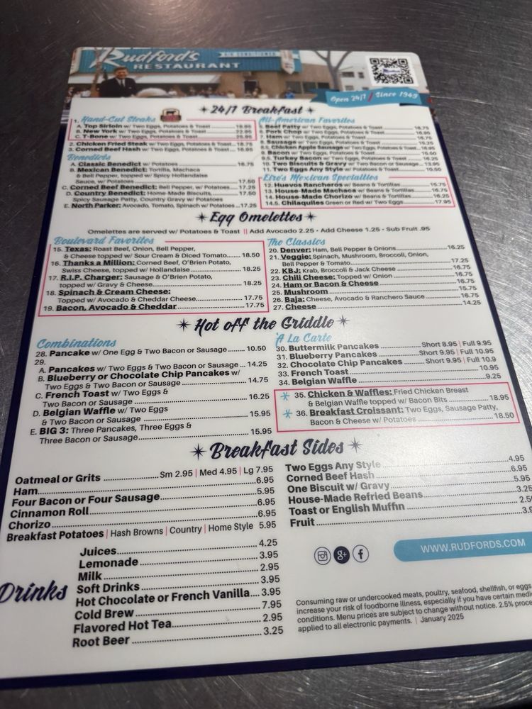 Rudford's Restaurant is a classic diner in San Diego, known for its hearty breakfast and brunch options. Located on 2900 El Cajon Blvd, this restaurant offers a wide range of dishes, from New York Steak to Bacon to Veggie Omelettes. The menu also includes delicious Benedicts like the Classic Eggs Benedict and Mexican Eggs Benedict. Customers rave about the generous portion sizes, friendly staff, and tasty food. Whether you're craving French Toast or Fish & Chips, Rudford's has something for everyone. The retro vibe and 24/7 hours make it a great spot for families or date nights. Don't miss out on their famous banana milkshakes, a must-try according to patrons. Overall, Rudford's Restaurant provides a welcoming atmosphere, delicious food, and a touch of nostalgia that keeps customers coming back for more.